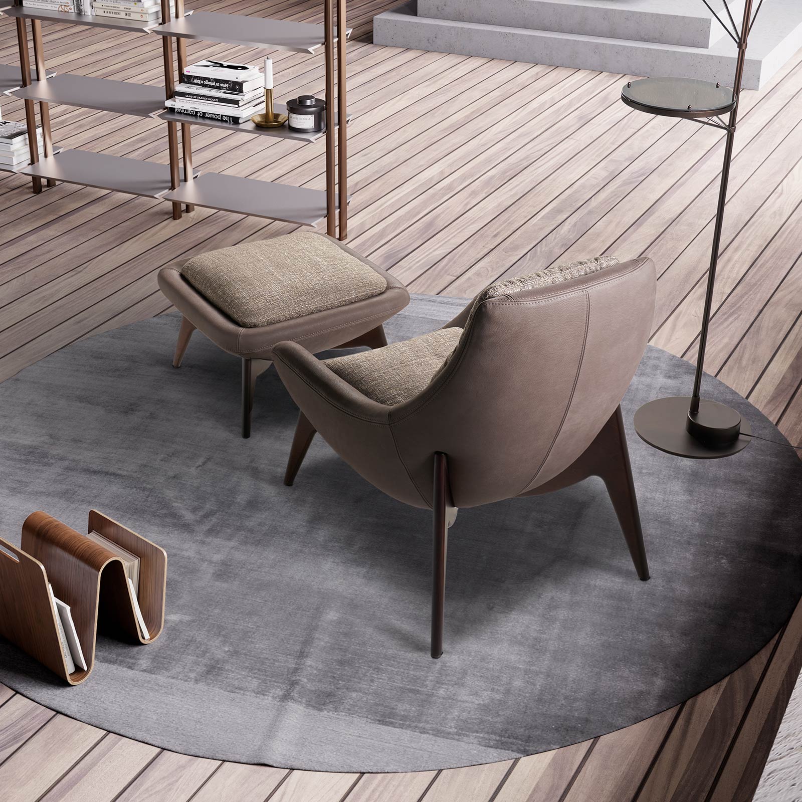 Sleek and sculptural, the Bizza Chair combines sweeping curves with a deep, cushioned seat and modern, tapered legs. A round swivel base is also available.