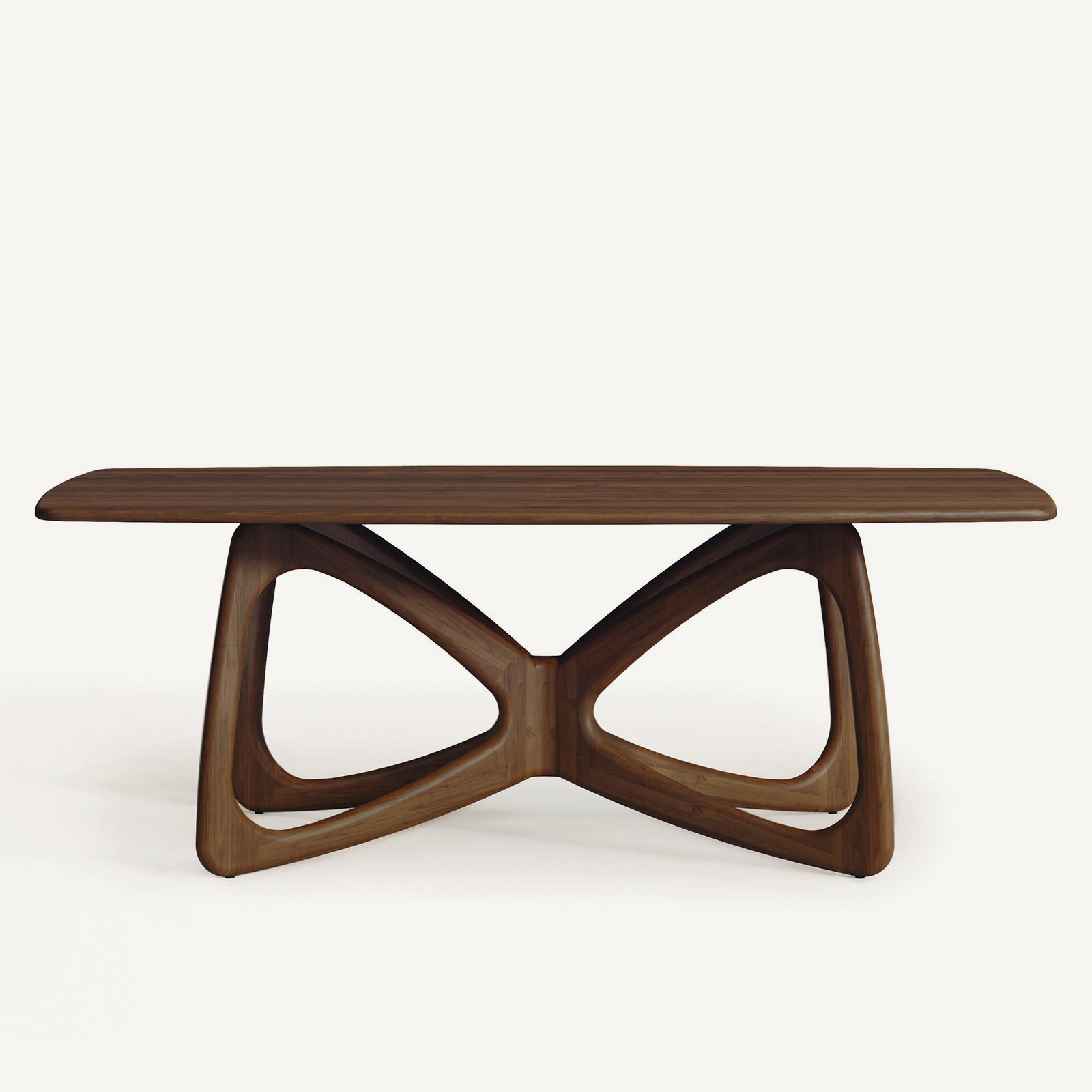 The Butterfly Collection is made from solid walnut or solid oak in several finish options. The finish is GREENGUARD Certified for low chemical emissions. Available with a wood top, a tempered glass top, or a sintered stone top in two color options.