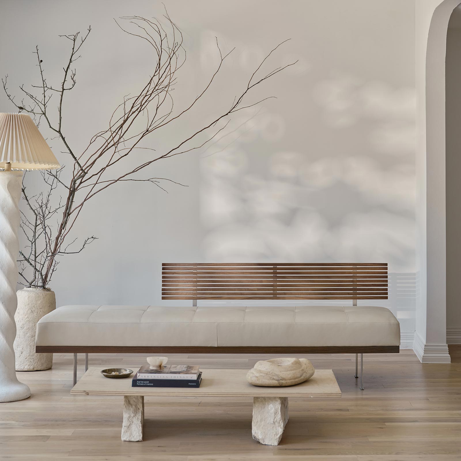 The Knox Bench makes a powerful design statement, recalling the mid-century design emphasis on clean, simple lines. The solid wood slats of the back, supported by exposed stainless steel hardware and softened by a perfectly proportioned pillow, command attention in any space.