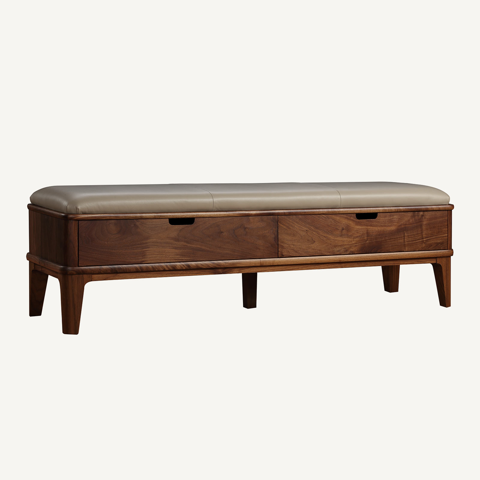 The Walnut Grove Bench offers a tightly upholstered seat atop beautifully tapered legs and two spacious, functional drawers. Its midcentury modern design is flexible enough for any room setting.