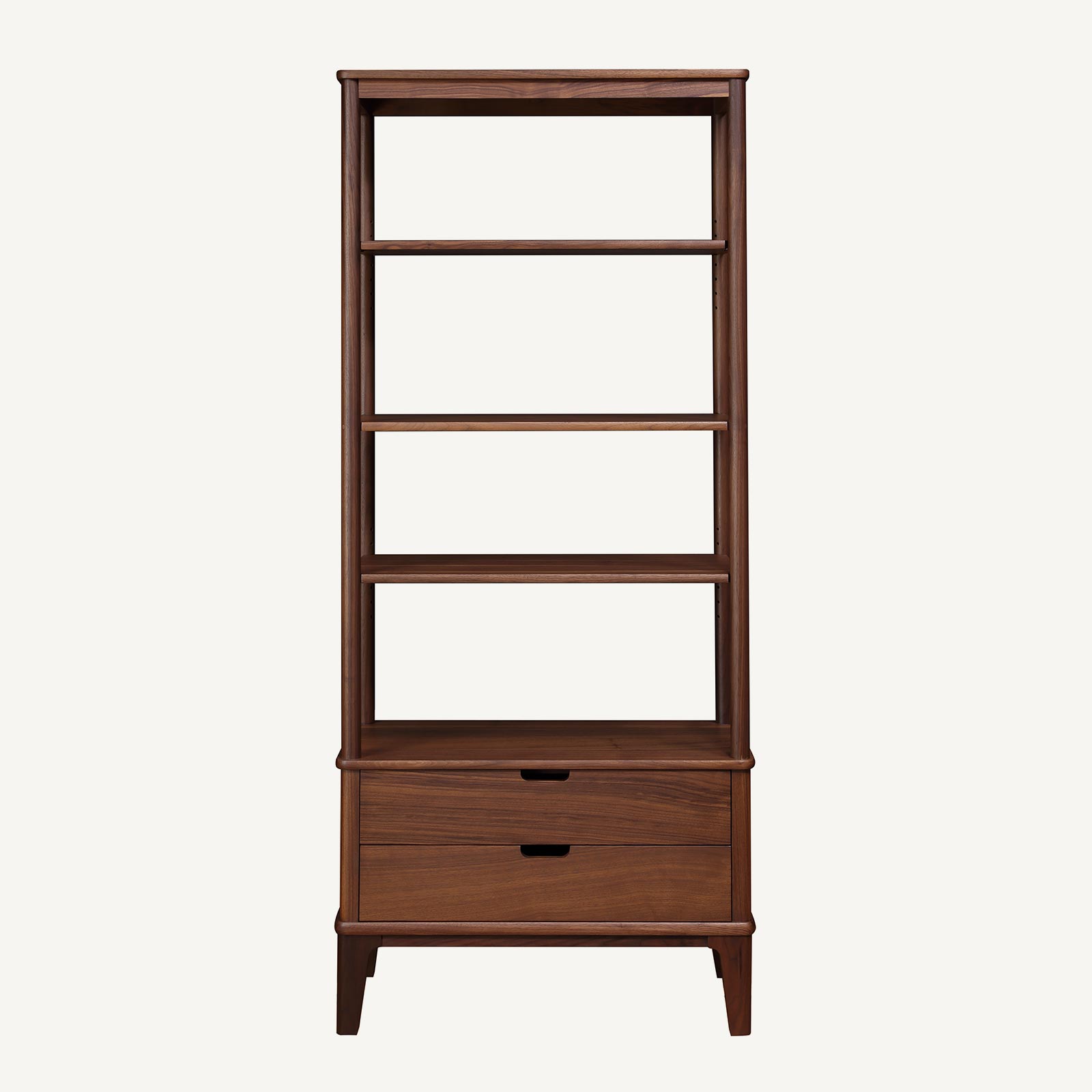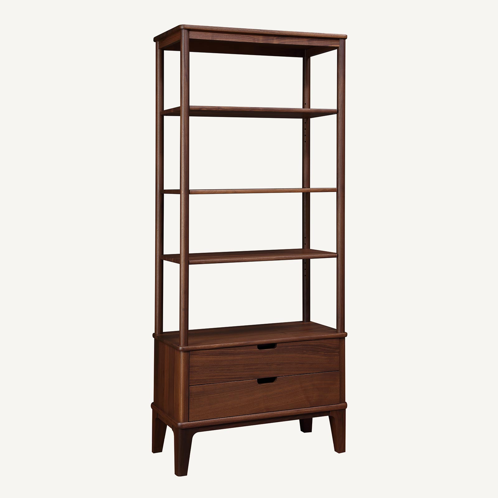 In the Walnut Grove Bookcase, beautifully rounded walnut supports hold three floating shelves, two of which are adjustable. In addition to more than ten feet of display area, it also offers two drawers for storage.