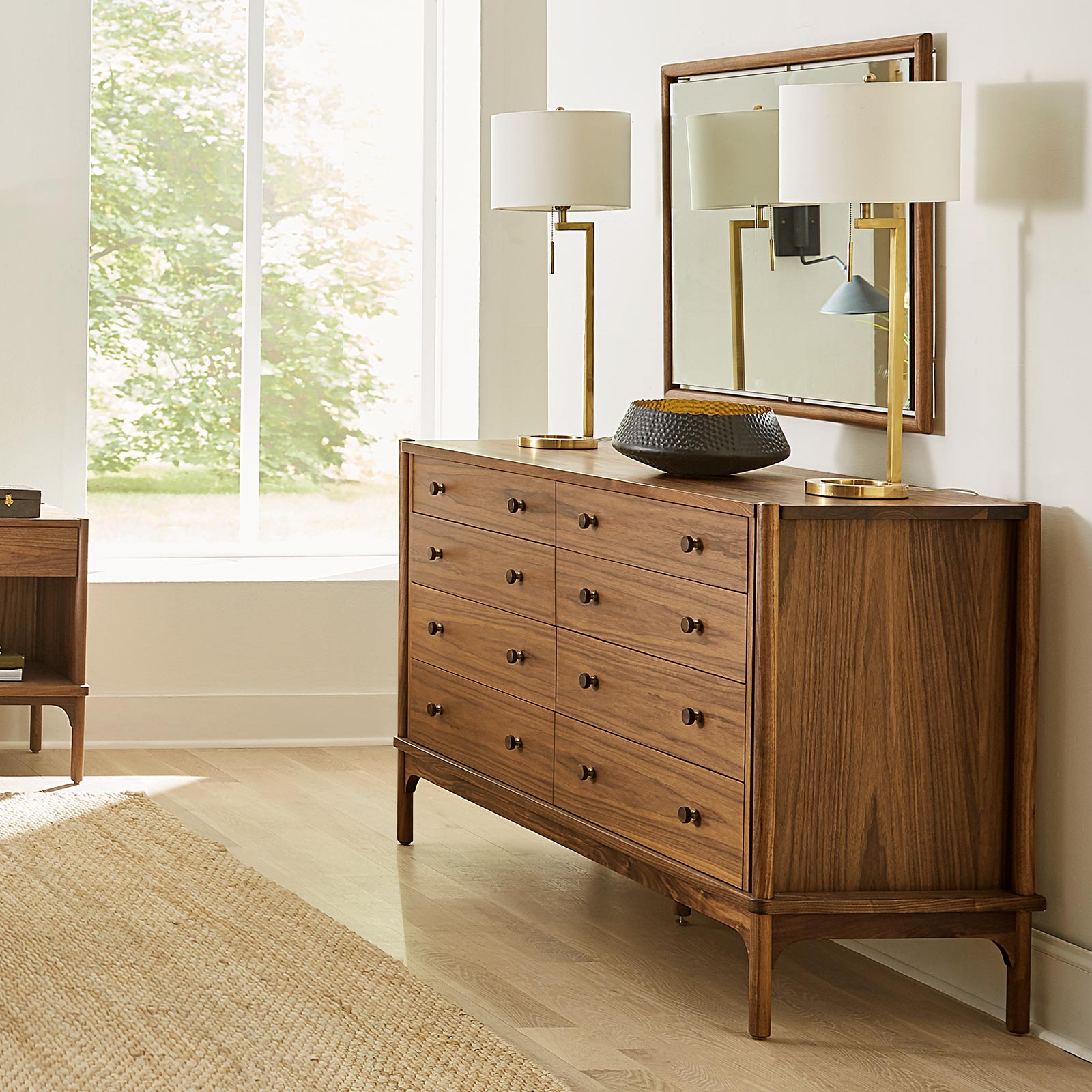 The eight-drawer Walnut Grove Dresser displays the inherent beauty of walnut grain. Exposed pin joints speak to its lasting construction, and custom-turned walnut knobs with soft brass accents add a unique touch to a piece that is as functional as it is attractive.