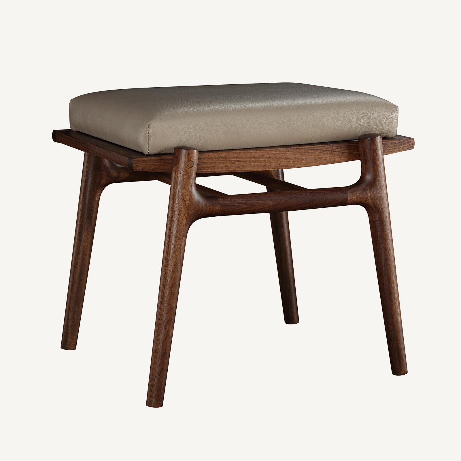 The Walnut Grove Footstool nestles delicately beneath the Walnut Grove Cocktail Table or holds its own as an accent piece. It features four gracefully tapered legs in mid-century modern style connected to a shaped wooden frame, and the tightly upholstered seat is available in fabric or leather.