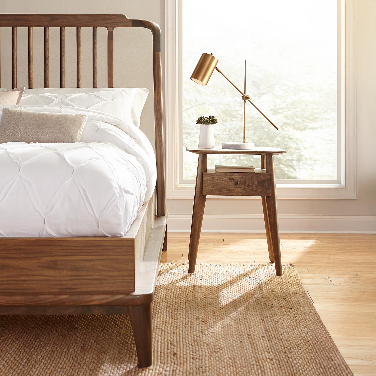 The midcentury modern Walnut Grove Nightstand offers ample storage with its floating box drawer and open shelving. Flowing round posts beautifully showcase the charm of rich walnut.