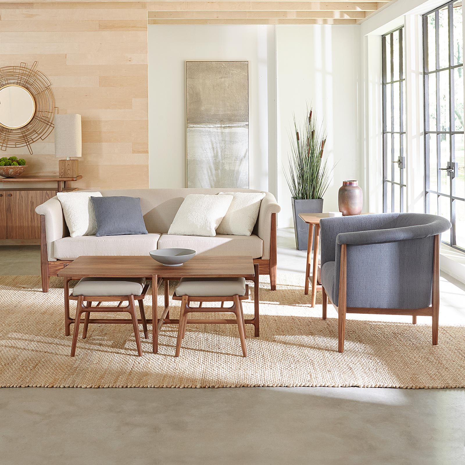 Create a feeling of comfortable elegance with the Walnut Grove Sofa’s inviting midcentury modern shape. Gently rolling arms flow into a tight back that is tailored for extra comfort. Shaped front legs and an exposed front rail create a visual contrast between solid wood and soft upholstery.